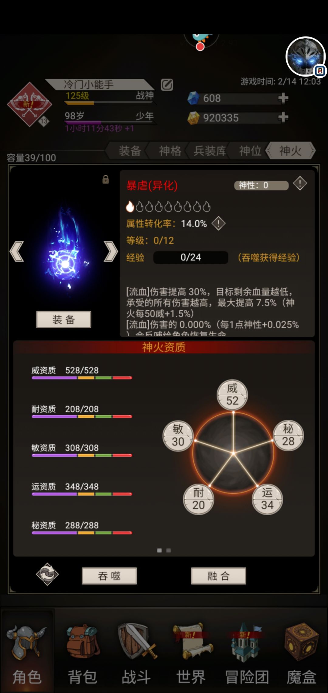 经过了各种浪费以后,终于对神火了解的差不多了 官方这块没指引实在是太坑了 话不多说,直接进去主题 神火主要有两个属性:资质和特性 资质影响神火的属性,也就是右边圆圈的数值,神火星级越高,转化率越高。可以理解为:资质*转化率*级别=右边 特性,类似于附带技能,对应资质达到6-9-1200会获得神性。(特性主要获得是升级,融合更难获得) 首先我将神火分为2类 1.资质神火 像暴虐,主要提升输出的是根据