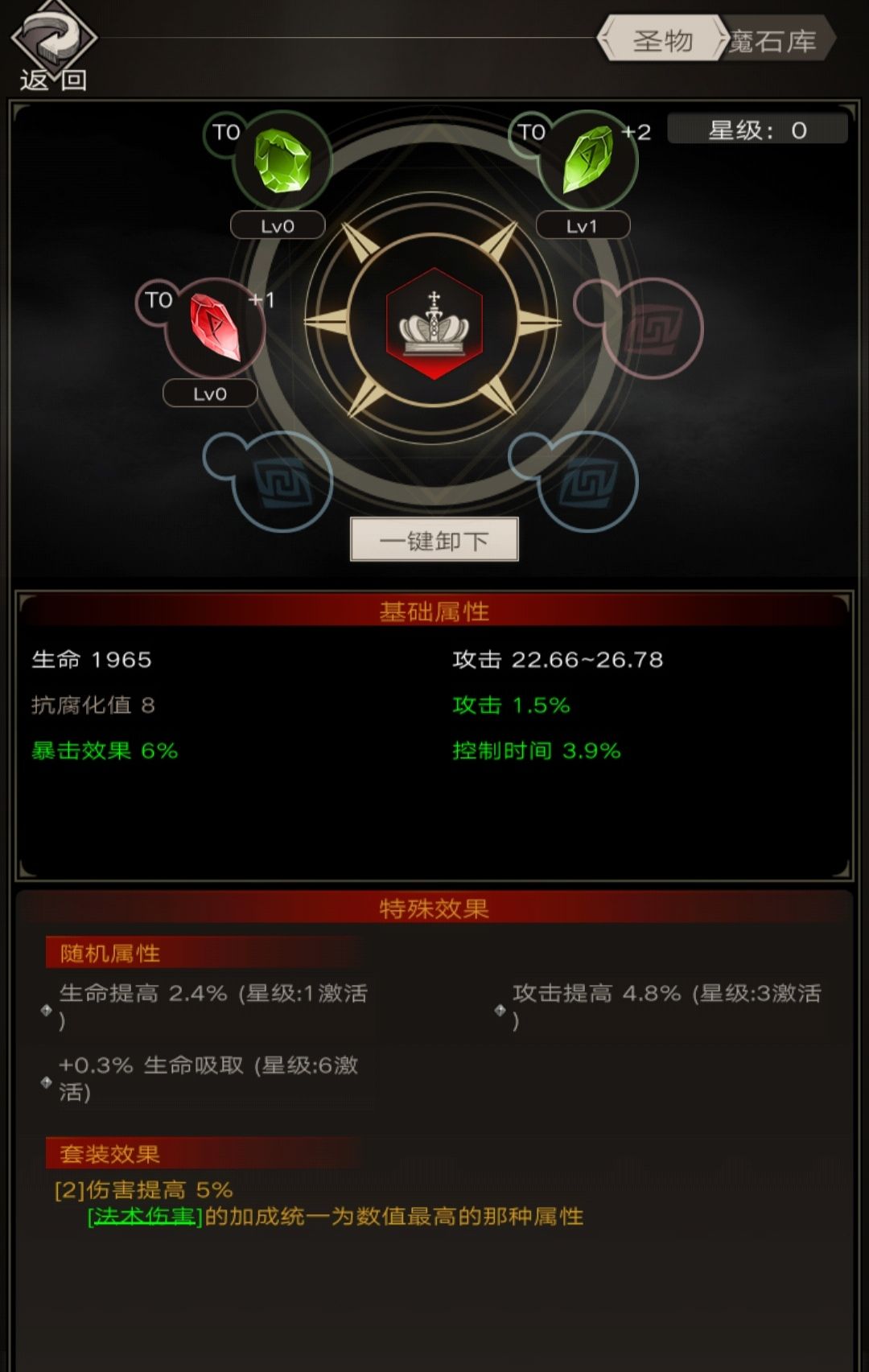 先遣服更新了新圣物系统,需要万神打通t240,才会开通深渊遗迹和圣物系统,今天来具体介绍一下新系统,废话不多说,开始: 1.圣物系统简介 2.圣物 3.魔石库(核心) 4.圣物系统材料获取 5.小结 1.圣物系统简介 圣物系统分为两部分,分别是圣物和魔石库,圣物即为中间的精灵之冠,魔石则是旁边镶嵌的石头,魔石库则显示所有魔石。 圣物会有随机的词条,魔石则是会有固定的属性(可提升),另外镶嵌相同魔石