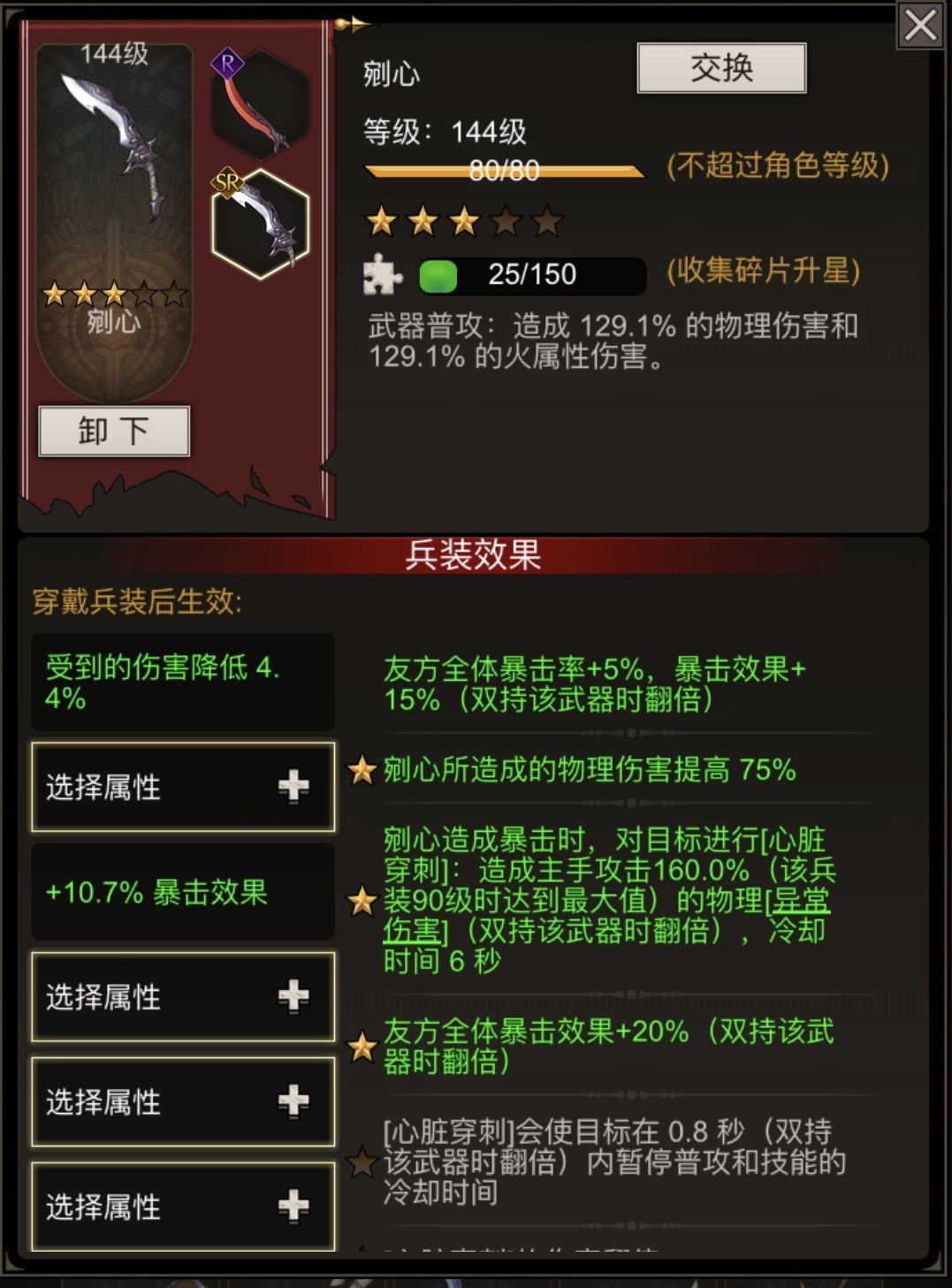 前言 老牛对部分老兵装比较关心,目前有很多兵装各种玩法得到充分的开发,但是还是有部分兵装基本上没人玩。如:剜心、双子、雷神之矛、无尽深渊、原生宝珠、镜盾等,版本交替,各领风骚,但这些从来没用上场的机会。估计开发也没有精力管这些冷门兵装,特水一贴发表一下我对改版剜心的建议。 当前版本 上图 猜测开发者对剜心的定位: 1.主要伤害组成部分为:武器、心脏穿刺 2.特色:暴击额外产生技能心脏穿刺,四星效果