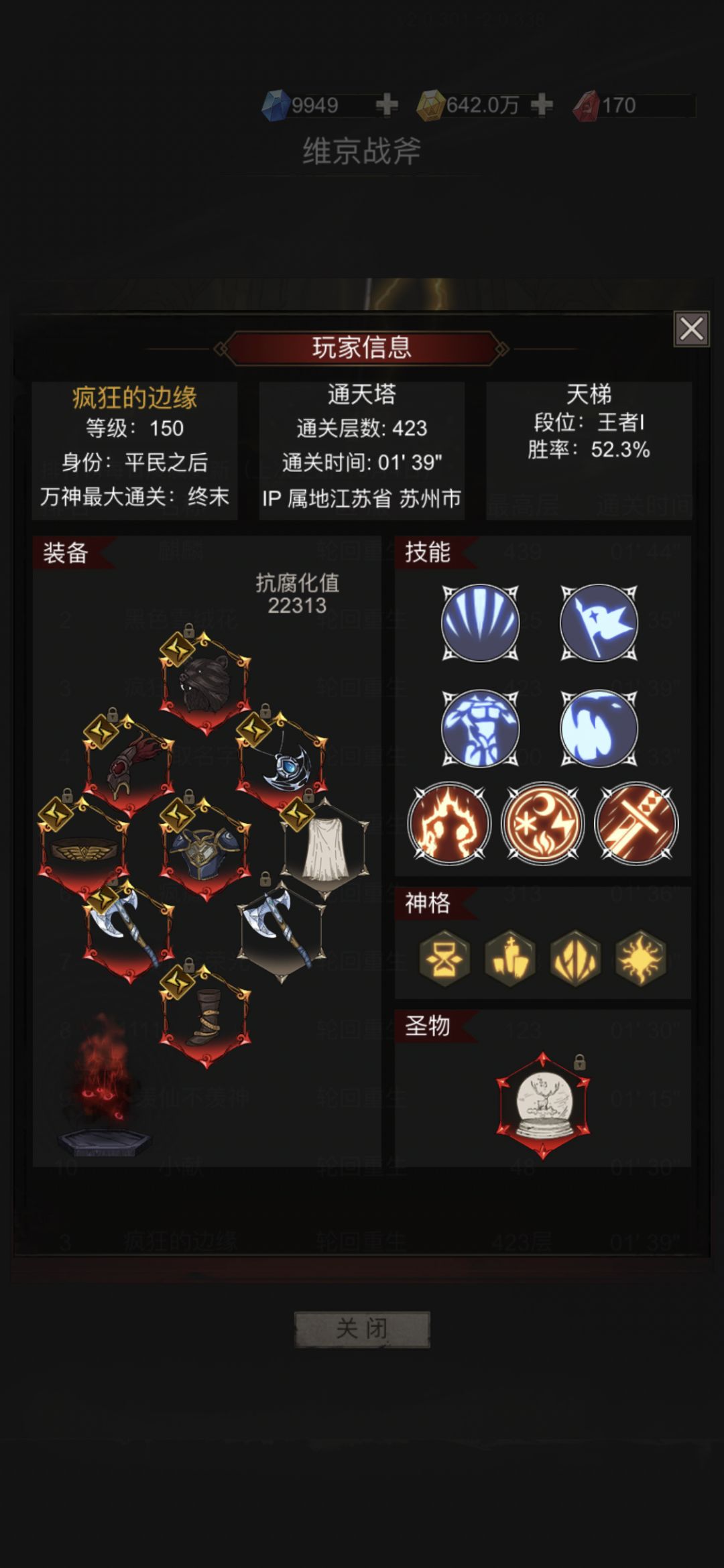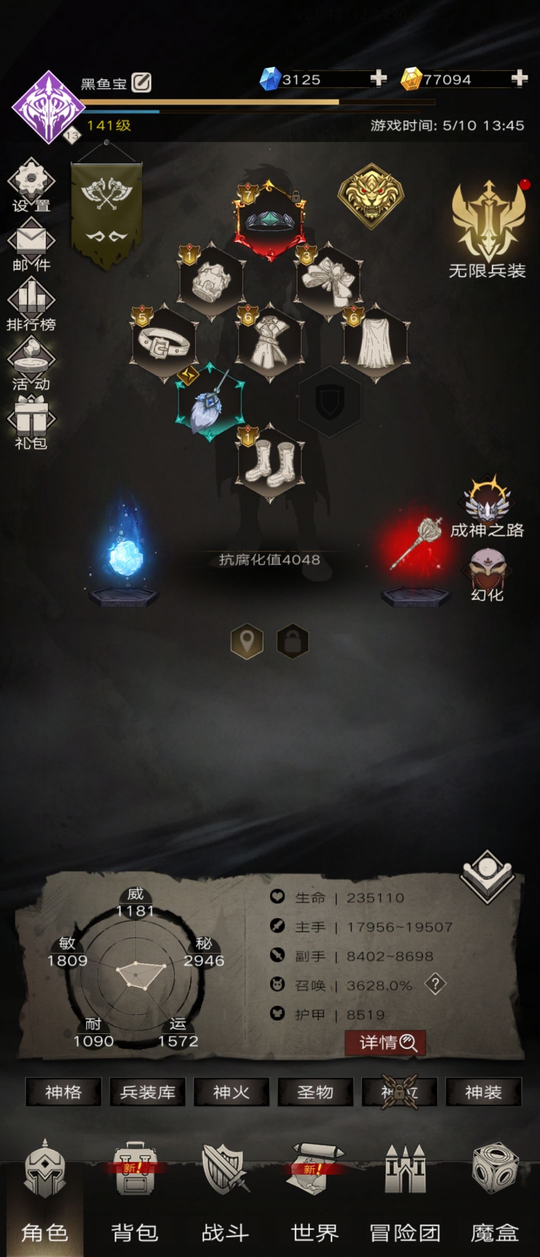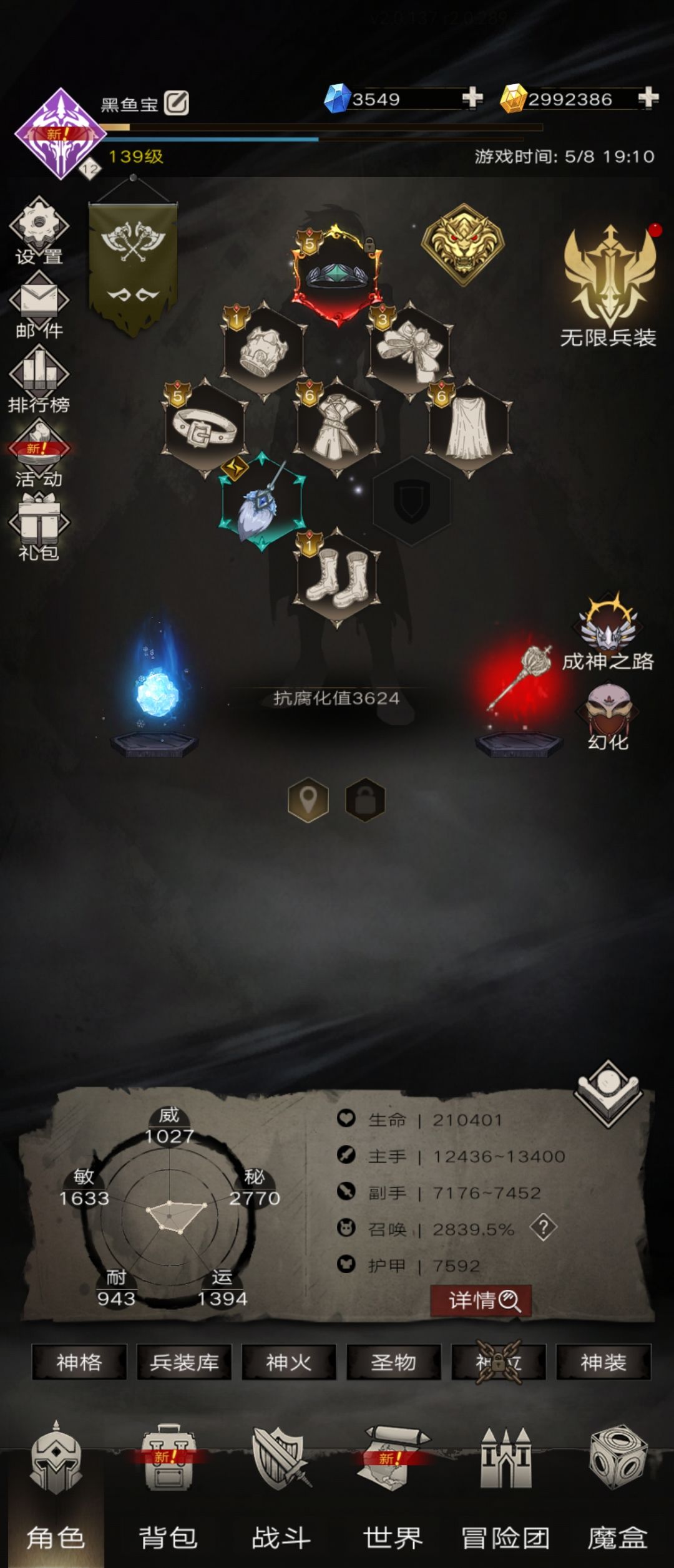 从上次发文至今,就一直在卡。 之前用模具没弄出好的属性的极限武器,干脆就随便打了一把,等开出黑铁后,就没红魂重铸了。 从88级到96级,重置了下神格,养了养神火,通天上了几层,万神没什么进步。 97级,刷万神时出了个升华黄披风,能打过T46了。之后打了个红披风,不过仍卡T47,腐化太低。 圣物换了个红的,不过属性不好,且星级不够,暂时还是用的紫的。 神庙坍塌后整了个无限平衡套玩,感觉跟披荆斩棘差不