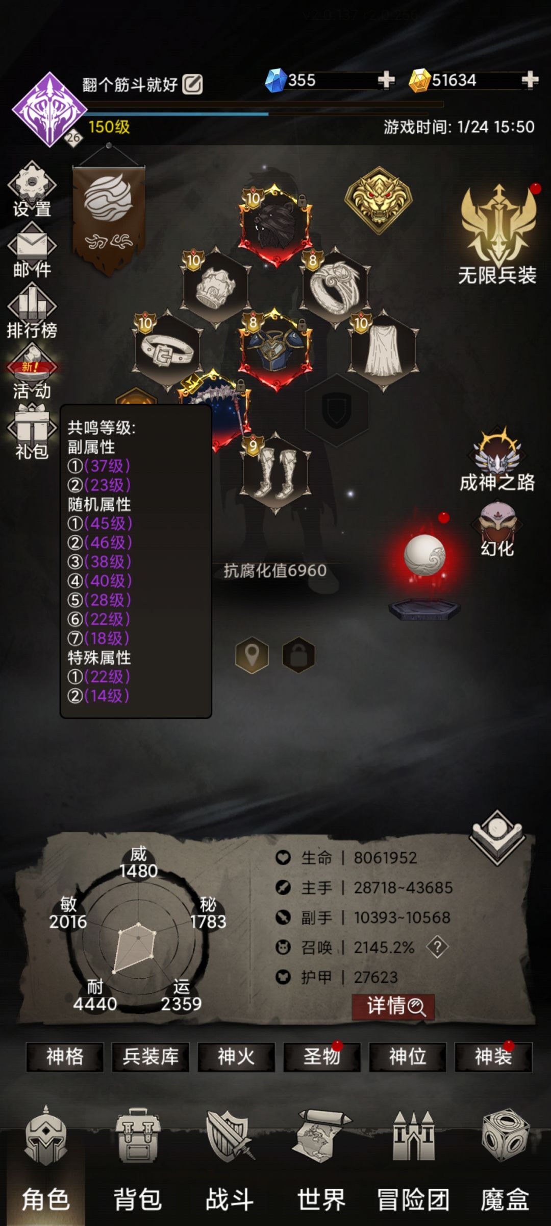 4区 fomsky 本文为80后发展 因为入服晚了几天所以才刚到80 兵装4星.装备按排名来看不算拖后腿 之前因为增幅流镰刀实在看不到未来所以秉着玩不动就转兵装的想法大改了build.现有非常大的突破 本build为初到80.因为80后神位属性提升非常大,现在神位2级 按着神位的属性增长混到T60应该不是问题 T50已通,装备全绿,武器升华绿,武器衣服头+16其余+10 通天132,国庆没空挂,估