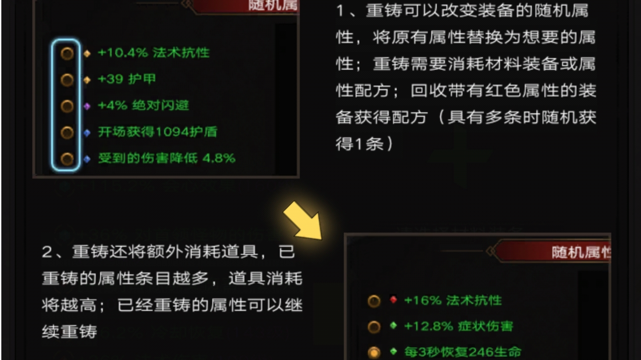 本帖子将介绍装备重铸中用来节省重铸材料的一种方式。方便新入坑的玩家更好的进行装备制作。 此技巧适用于所有需要重铸系统包括。武器,装备,圣物等。其中在制作神器和8词条毕业圣物的制作用尤其实用。 在装备制作的过程中我们往往会碰到下面这样的情况:假设我需要把3转技能等级(以下称为目标词条)重铸到神器词条中去,直接使用配方进行重铸的情况下,多次重铸后消耗的材料会显著增加(实际消耗为使用装备进行重铸的4