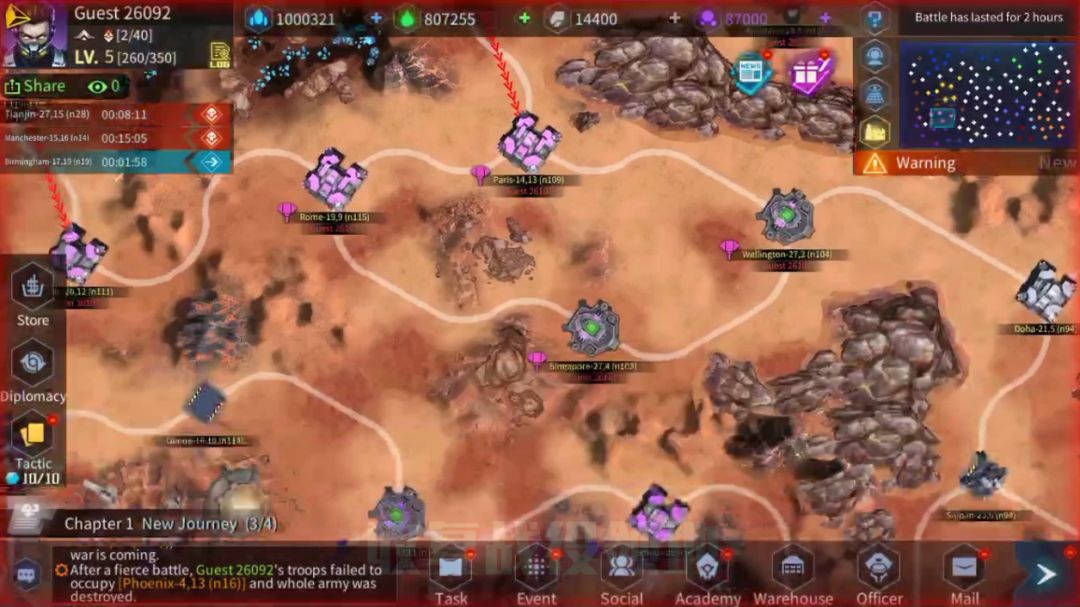 新增功能:1.标记功能:结盟后,可以选择地图上的据点进行标记,盟友可以看到此据点特殊显示,方便盟友沟通.标记显示一段时间后将会自动消失.2.调整击杀提示.优化体验1.招募效果优化.2.驻防信息显示优化:有驻防部队的据点,增加特殊标记.3.小地图标记显示优化.4.战斗音效优化.5.字体显示优化.技能修改:1.燃烧类技能伤害提高.帕里斯:技能伤害95%提升至100%.阿特拉斯: