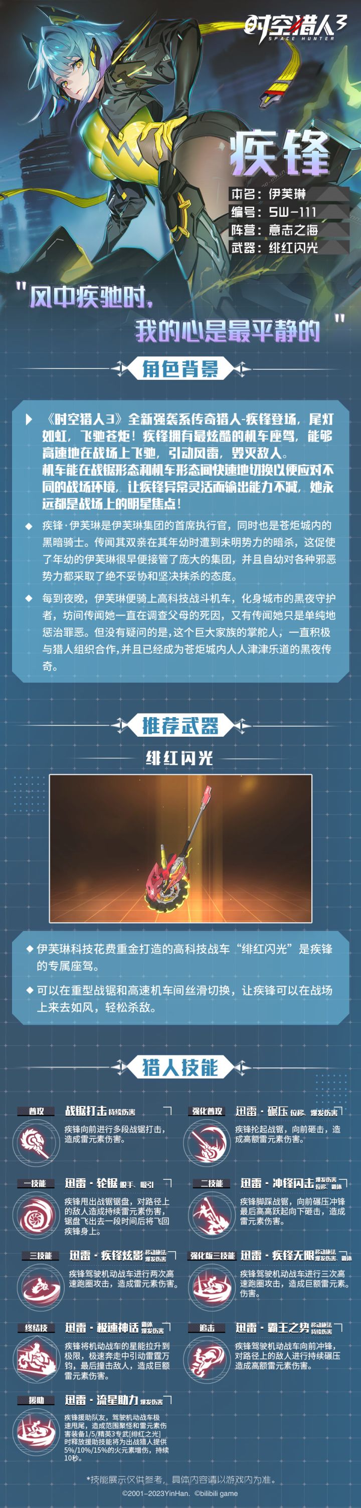 ▷ 代号 | 疾锋▷ 姓名 | 伊芙琳▷ 阵营 | 意志之海〓 战场表现 〓▷ 猎人属性 | 强袭▷ 初始品阶 | 史诗级▷ 推荐武器 | 绯红闪光“风中疾驰时,我的心是最平静的”「疾锋」拥有最炫酷的机车座驾,能够高速地在战场上飞驰,引动风雷,毁灭敌人。机车能在战锯形态和机车形态间快速地切换以便应对不同的战场环境,让疾锋异常灵活而输出能力不减,她永远都是战场上的明星焦点!〓 阿
