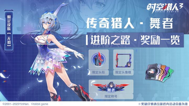 「舞者」限定皮肤一睹为快!活动时间:3月15日更新后——4月12日05:00活动说明:◆活动期间提升传奇猎人「舞者」,可通过【进阶之路】领取限定头衔、限定头像框、限定称号、限定皮肤、传奇招募券、战魂补给券、武器补给券、猎能补给券等品质达标奖励,并解锁相应档位的特惠礼包~※更多关于传奇猎人「舞者」相关活动信息与奖励详情,还请指挥官以游戏内活动页面为准~※皮肤仅为立绘展示,游戏内3D人物模