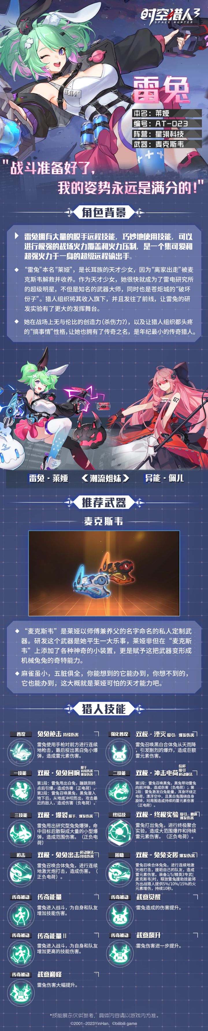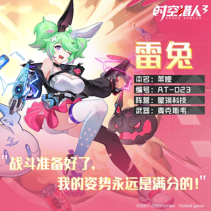 ▷ 代号 | 雷兔▷ 姓名 | 莱娅▷ 阵营 | 星翎科技〓 战场表现 〓▷ 猎人属性 | 超能▷ 初始品阶 | 史诗级▷ 推荐武器 | 麦克斯韦“战斗准备好了,我的姿势永远是满分的!”「雷兔」拥有大量的脱手远程技能,巧妙地使用技能,可以进行极强的战场火力覆盖和火力压制,是一个集可爱和超强火力于一身的超级远程输出手。〓 阿达拉生活 〓▷ 性格特征 | 好奇宝宝、中二病、最强大脑