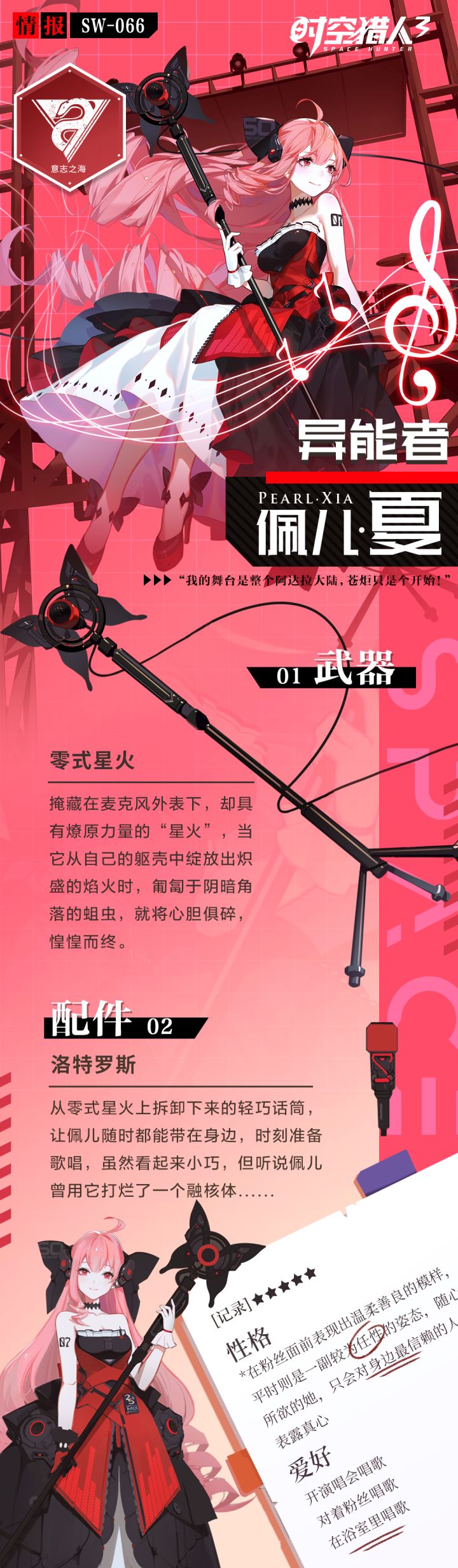 各位猎人指挥官:喵哈喽~我是喵酱(。◝ᴗ◜。)~好久没和指挥官分享新角色的消息了这次特来分享新角色•异能者的相关情报话不多说,赶紧来看看吧~!(。-`ω´-)【猎人档案】◣档案级别:XH◥>>身份验证通过>>开始读取猎人档案...>>读取完毕▶姓名|佩儿•夏◀▶代号|异能者◀「我的舞台是整个阿达拉大陆,苍炬只是个开始!」▶个人资料◀塔洛姆家族的独女,由于某些原因脱离了