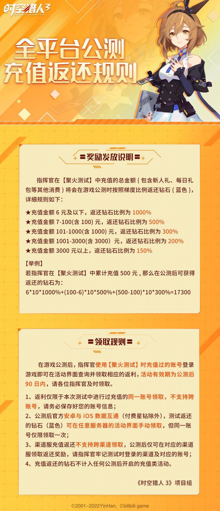 尊敬的指挥官:《时空猎人3》全平台公测即将于6月29日开启!届时指挥官可使用在【聚火测试】时充值过的账号登录游戏,并于活动界面查询、领取相应返利。更多领取详情还请指挥官关注本期《全平台公测充值返还规则》~6月29日,再聚阿达拉!
