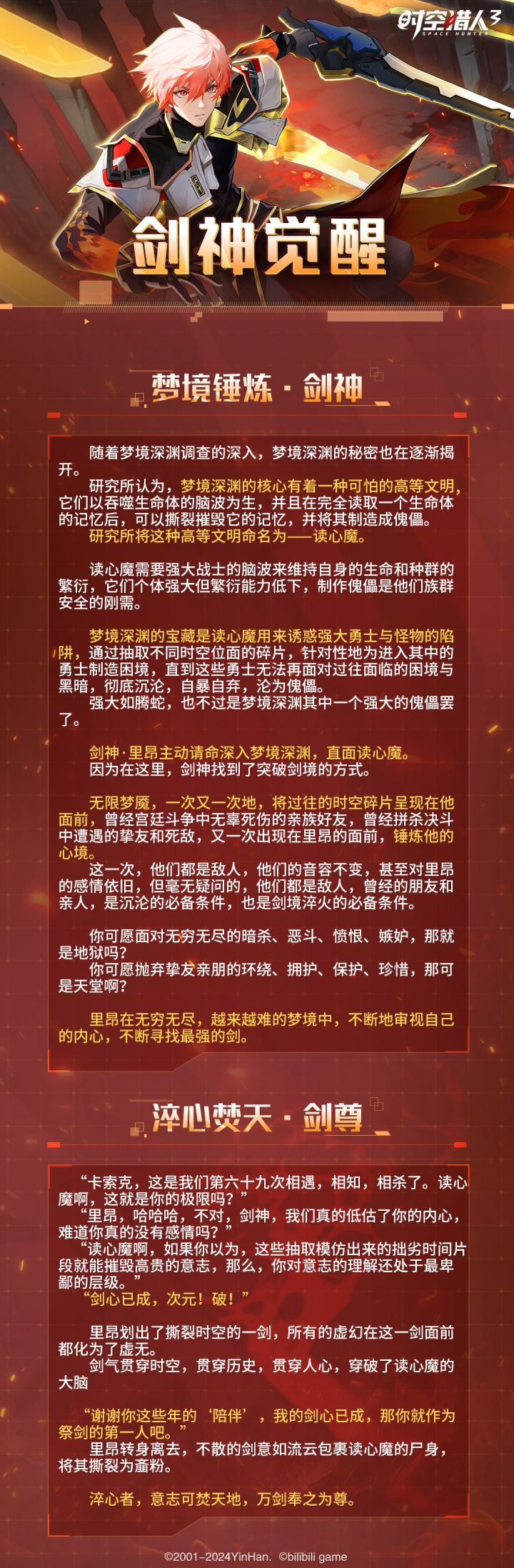 剑神·里昂主动请命深入梦境深渊,直面读心魔。因为在这里,剑神找到了突破剑境的方式。无限梦魇,一次又一次地,将过往的时空碎片呈现在他面前。曾经宫廷斗争中无辜死伤的亲族好友,曾经拼杀决斗中遭遇的挚友和死敌,又一次出现在里昂的面前,锤炼他的心境。这一次,他们都是敌人,他们的音容不变,甚至对里昂的感情依旧,但毫无疑问的,他们都是敌人,曾经的朋友和亲人,是沉沦的必备条件,也是剑境淬火的必备条件。你可愿