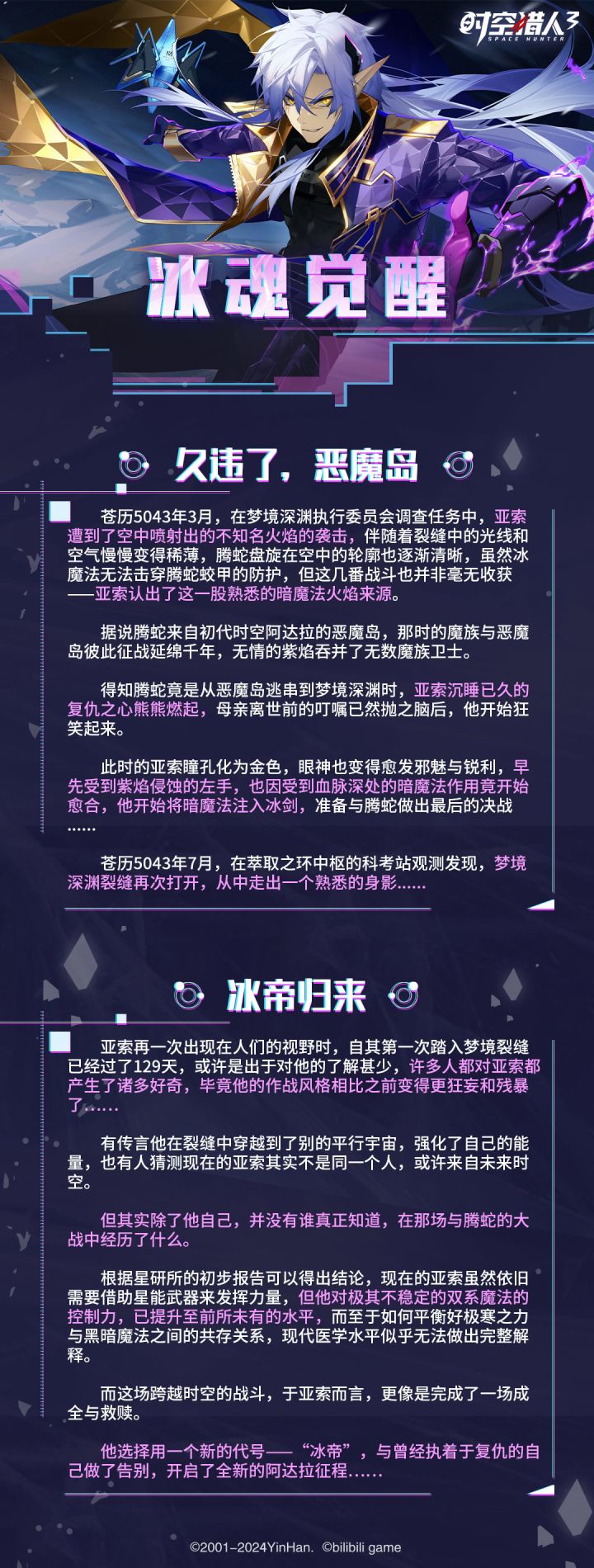 苍历5043年3月,在梦境深渊执行委员会调查任务中,亚索遭到了腾蛇的袭击。在与腾蛇惊险的大战中,血脉深处隐藏的暗魔法逐渐复苏,让亚索爆发出了冰系与暗魔法双系的绝强力量......苍历5043年7月,在萃取之环中枢的科考站观测发现,梦境深渊裂缝再次打开,从中走出一个熟悉的身影......他选择用一个新的代号——“冰帝”,与曾经执着于复仇的自己做了告别,开启了全新的阿达拉征程……〓 冰帝·亚索 “