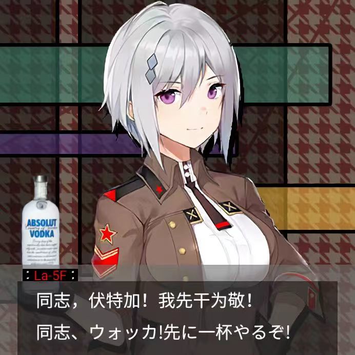 哦,最后提一嘴,我最喜欢的dolls是la5。禁欲型小秘书,人虽然严谨认真但喝口伏特加就变了个人,勉强自己的样子惹人喜爱,虽然自身实力不强但组苏空战斗机大队实力还是能看的。