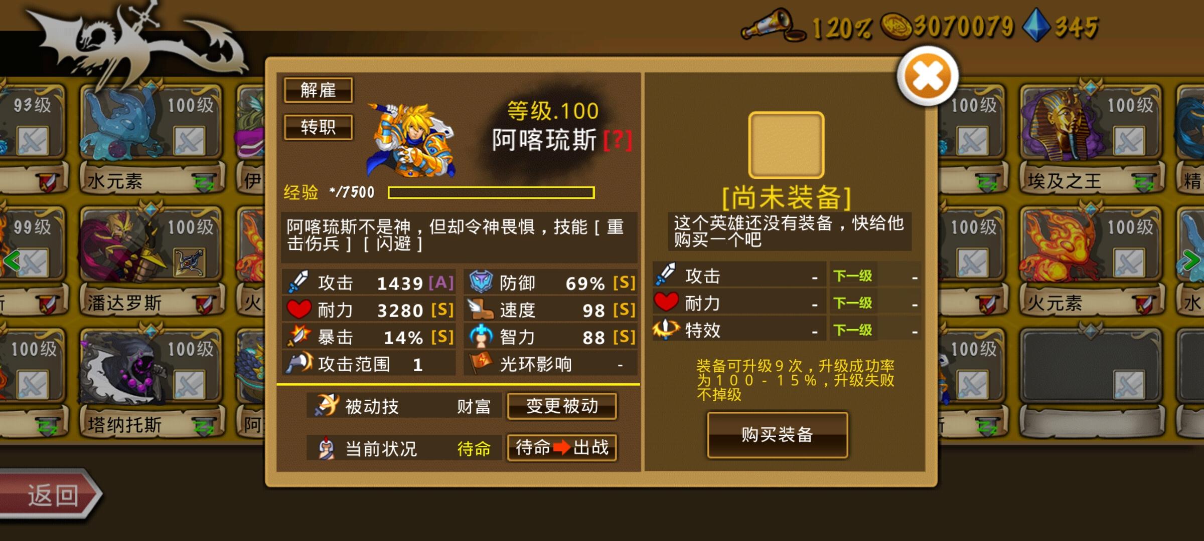 这些英雄很强力,这个阵容也很不错--来自玩家E12956 阵容如图 1.海神需要7级以上武器,8级最好,武器神刃逆空 海神群攻用来清前期路上小兵,攻击不够很容易少员 2.魔龙需要装备六神,7级以上,魔龙配合妖精的回血,可以轻松顶住boss的攻击,让弓箭手后面biubiubiu输出,魔龙需要耐,防,速s以上 3.精英弓箭手,我是四个二转,武器银驽,3级。属性攻击优先 4.图二,火精灵出现的