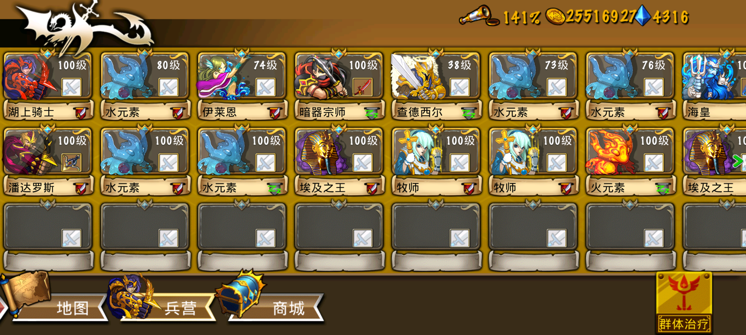 这些英雄很强力,这个阵容也很不错--来自玩家E02477 阵容: 弓团,海神2,重盾4,精弓5,水灵6,湖仙2,精灵1 老实推秘境去了 最近时间也不够每天只能过任务领点钻石 基本都没时间刷钻 暂时先不转奶团了[表情_捂脸哭]