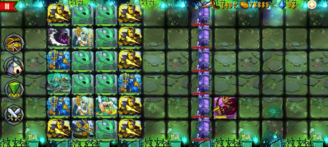 策略军团地狱秘境越到后期关卡难度越大,其中一类关卡很容易造成玩家卡关,典型代表是第63关,笔者称之为“夹击型”关卡,表现为行进路上在玩家队伍的前后都会出现敌人,后方(屏幕左边)为远程弓手,前方(屏幕右方)敌人会有三列,由左至右分别是近战(如天使、阿喀)、中程(如雷神、火神)及远程(如投石、轻弓、鬼弓、弓神)。两边的远程射程超远,不能通过常规的拉开距离风筝战术处理,没有针对性策略,很容易大面积减员甚