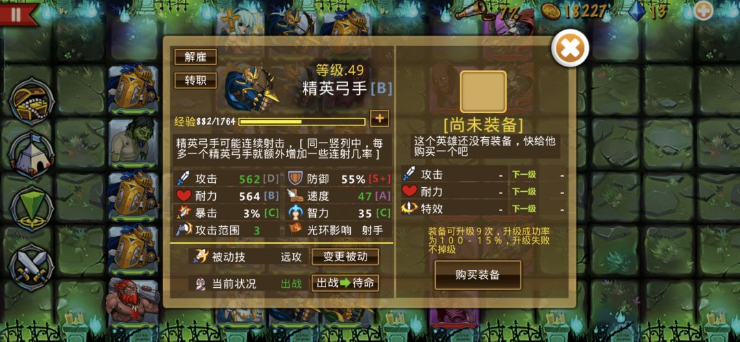 这次选择弓团开局。 前期第一章还算好过,但是金币不太够用,我是第一次遇见精英弓手先抓两列,加上前面4个武士和重盾,后面两个武士来过渡。 然后重要的是在1-30抓有(远攻)被动的弓手(好像我现在推到第五章,后面的弓手都是有装备但是没有远攻被动的,前期没钻石洗被动可以在这里抓,产出比较稳定) 还有推荐第二章开始才考虑刷金币,第一章产出太少,第二章因为速度优化,弓手还是一般比僵尸快上一些,比较好刷 我的