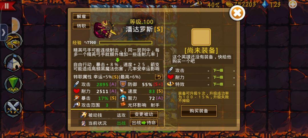 分享一下经验,很多都是在群里的大佬那学的。 开局选弓团长先抓精英弓,再买点武士夹汉堡,基本就能打过前几关了。在转职海神之前,先不要上水灵。撑到2-54和3-1买,海神加湖仙基本就能起飞了。优先出海神和湖仙,精英弓二转不着急。 弓团长:优先二转,带幸运,转职技能最好也是幸运。装备最好上专属。 水灵:抓攻击和暴击高的,被动财富幸运或者致命。优先攻击力高的。可以准备两套可以准备两套,一套财富用来刷钻石,
