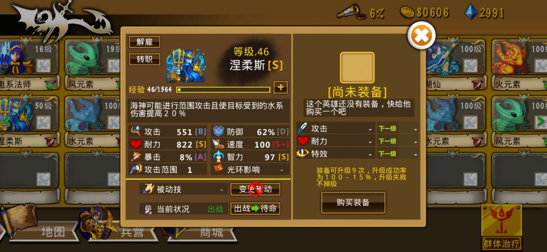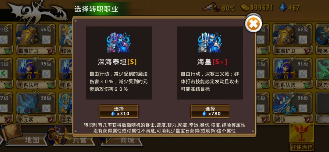 这些英雄很强力,这个阵容也很不错--来自玩家E02137 海皇(海神2转)的属性非常强大,不仅攻击范围广,而且血量也很高,配合几只水精灵,一击可以秒一片。 海皇往往搭配湖仙,因为湖仙不仅可以恢复周围生命而且转职后也会使队伍获得速度加成,从而在行动上获得优势。