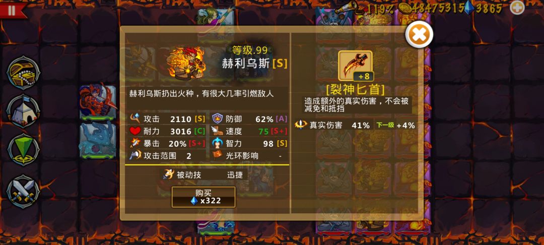 这些英雄很强力,这个阵容也很不错--来自玩家E22900 终于发现了这个游戏的正确打开方式。就是前期随便抓个阵容打,到了打不动的时候,把团长等级用钻升级一下,我是升到了91级,花了大概300多钻吧?然后再用金币从商城买阵容,这时候买来的都是团长一个等级的,等级压制啊,打起来就爽快多了。 我现在虽然只有几个91级的,但是等级上来后属性全方位的强,前排终于站的住了