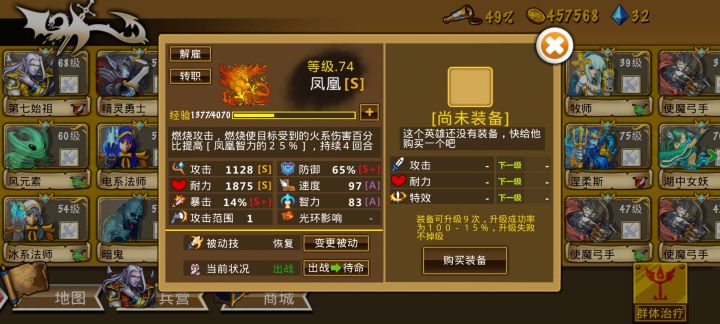 最近玩的很上头,分享下阵容--来自玩家 EF5072 阵容:梅林,火神2,冰龙4,大法师4,火灵3,湖仙2,独角兽2,凤凰3,北风之神2目前在3图努力,想要抓一队A攻击,S暴击的火灵,再二转买神刃,团长也要出专属戒指,进一步提升输出能力。