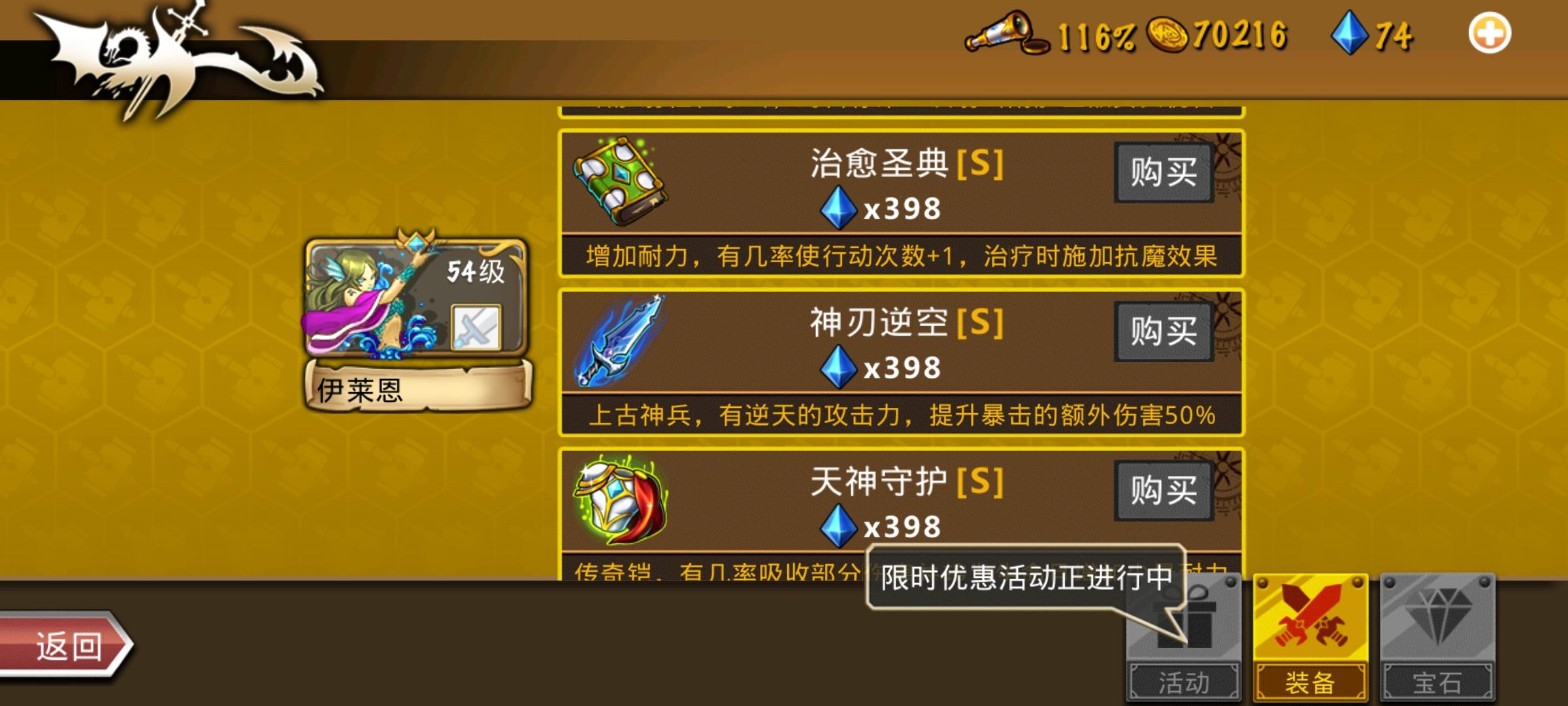 装备商店测试--来自玩家E14659 神刃逆空(攻略中的蓝刀):暴力输出流刷钻出装(推荐英雄:阿喀琉斯,海神)治愈圣典:辅助神器;加耐力,概率行动次数+1,治疗时加魔抗(湖仙专属)