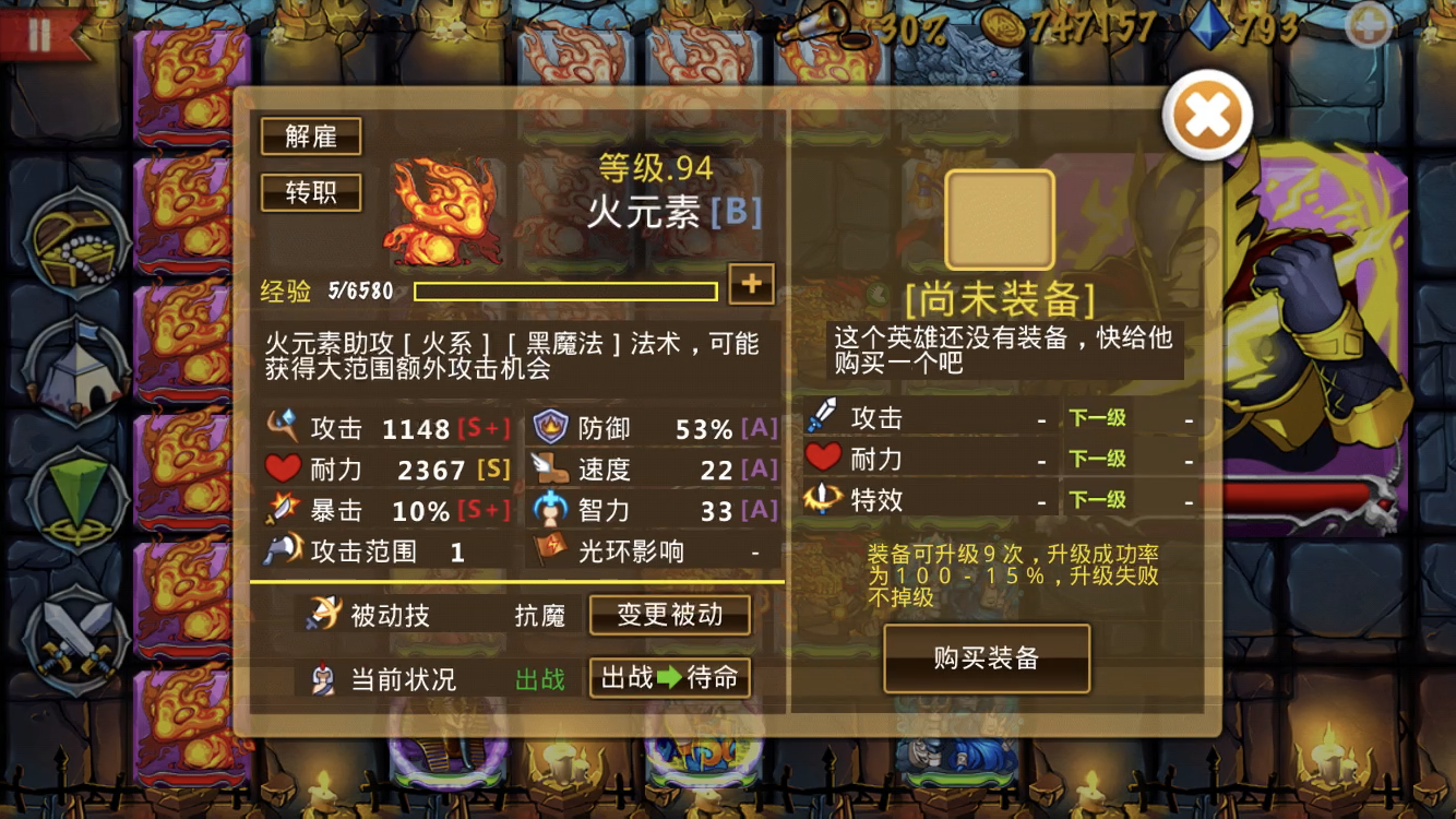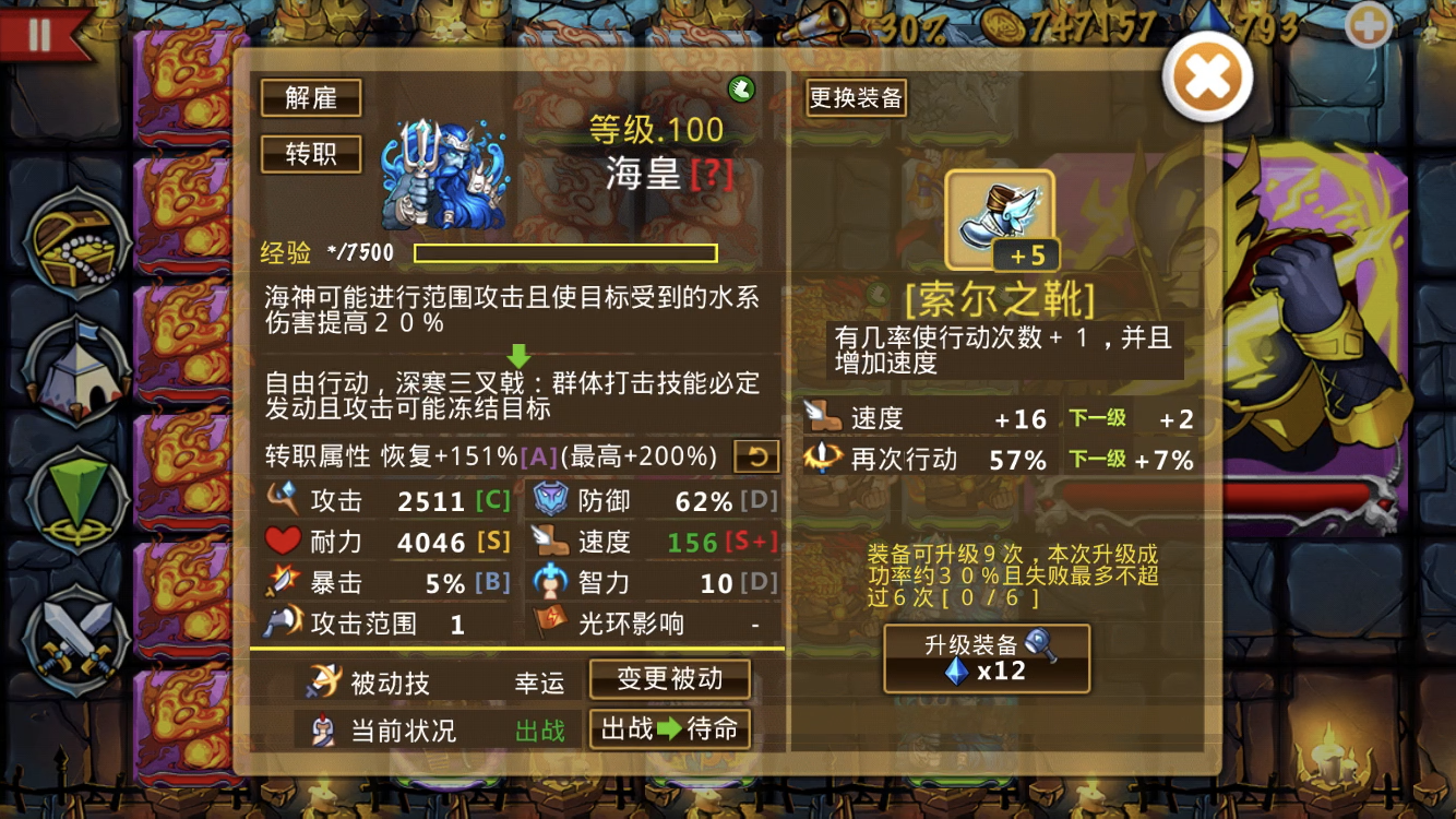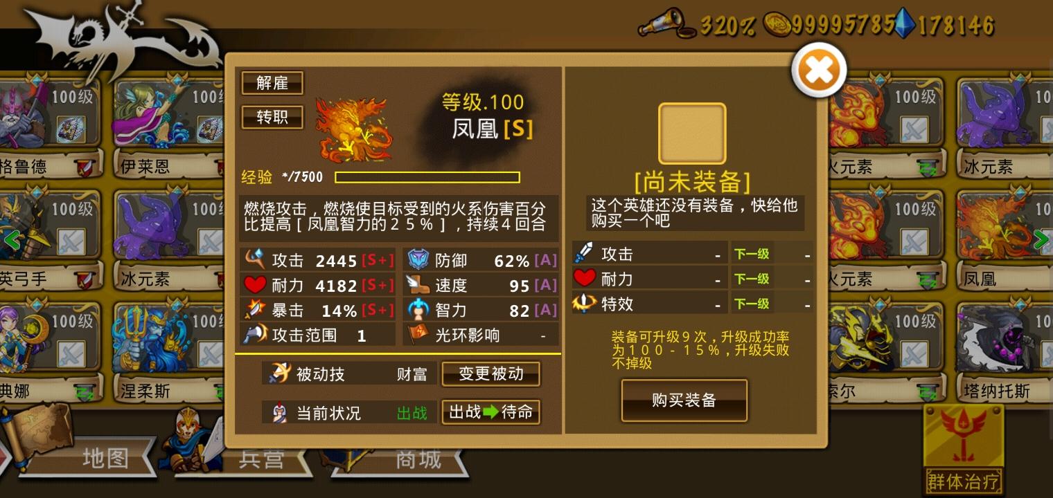分享码E14734很不错的游戏,可肝可休闲!用钻石把团长升到了91,买几个18000金币的小弟一路平推过去,已经到3图了,准备抓海神,就是属性不好,刷了很多次没有合适的!