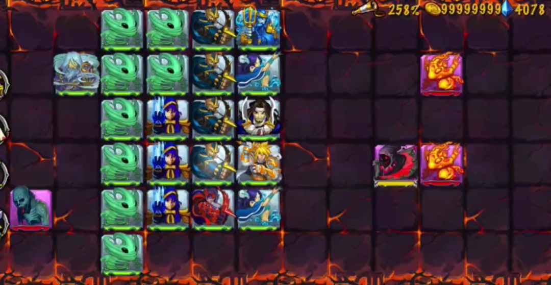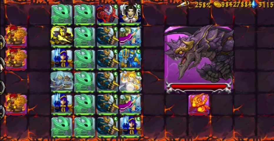 最后一排的25位置放上两个二转海神清理后面出现的火神,魔龙BOSS会打直线两个,只有在最右上角放炮灰吸引才能让BOSS只打一个,每回合送一个炮灰即可过关