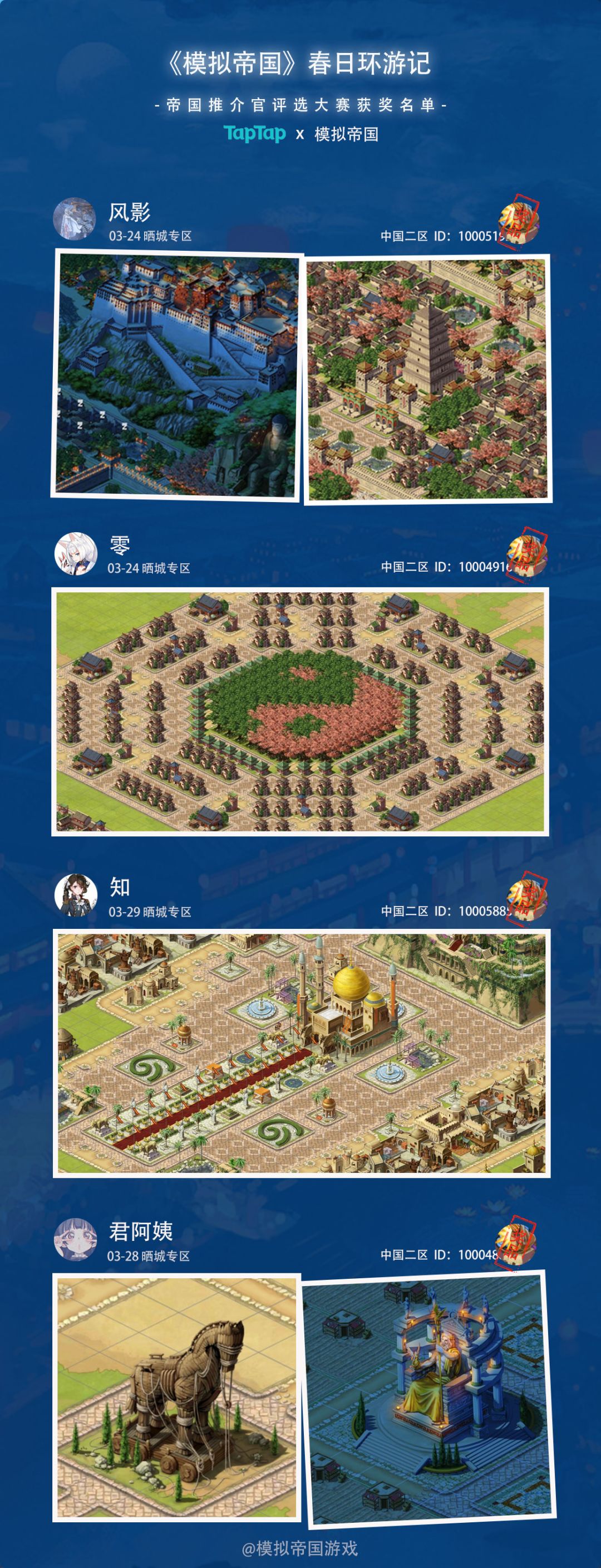 帝国环游,春光无限。 感谢执政官大大们的参与(/≧ω\) 恭喜以下获奖执政官,奖励“一键收获(30天)”将于今日发放至您参赛贴提供的游戏ID对应主城,请留意邮件信息噢(ɔˆ ³(ˆ⌣ˆc) 接下来让我们一同欣赏推介官们带来的帝国美景吧!