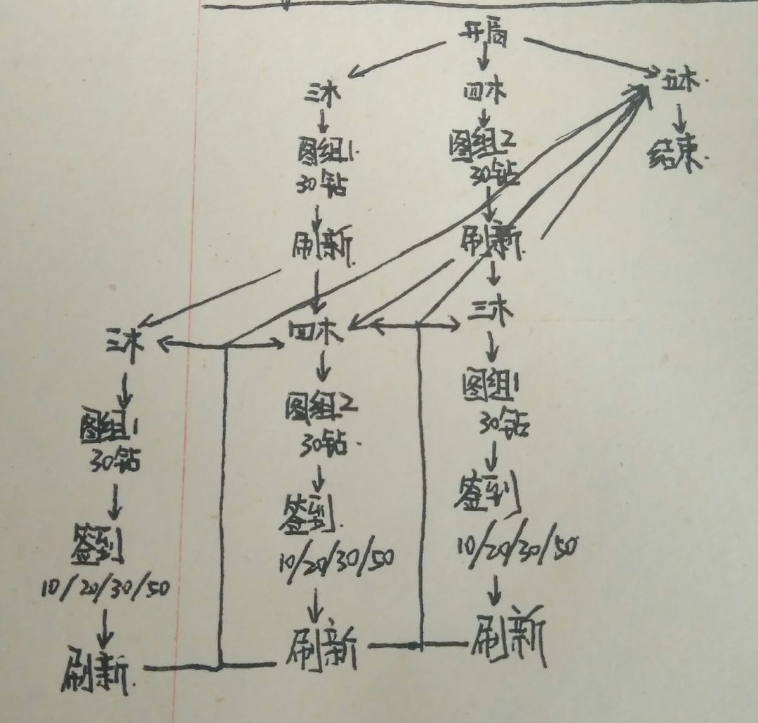 第七次刷新未刷到华夏五木,深思熟虑之下手绘了一个可以低氪或者不氪依旧可以持续刷新的流程图,希望可以帮助像我这样运气不好的玩家。。。