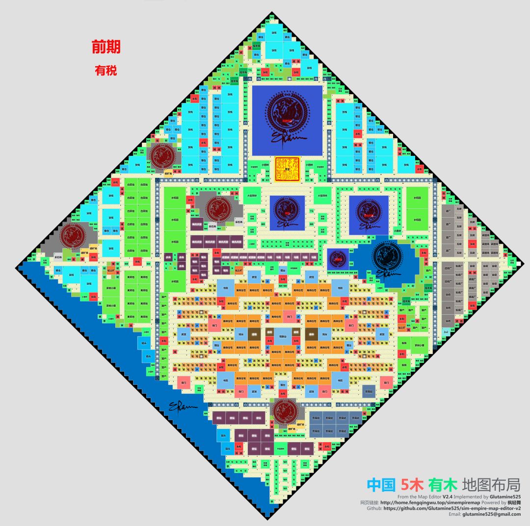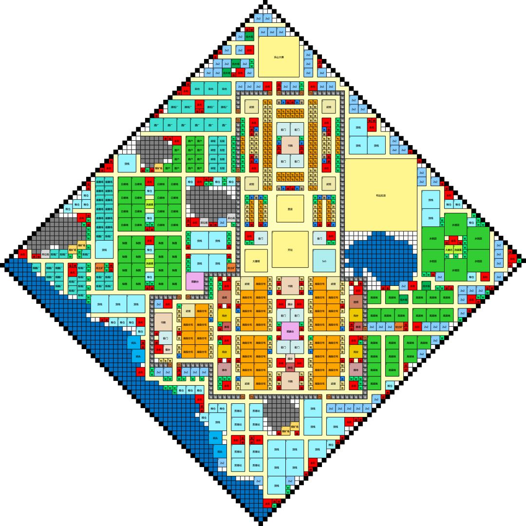 忘了是去年还是前年做的了,当时实在找不到合适的能从开头用到结尾不需要改布局图,自己做了一个。 玩那个一级一级的模式可以直接用,不过我记得在前期的时候,好像是有点人手不太够,需要拆一些建筑,完成任务升级。 如果这游戏这两年没有加一些什么新的建筑的或者有什么更改的话,这个图肯定是能能用的。 我当时做好这张图之后,从一级开始玩到全建满,在这期间也改了很多次,这是建完之后的最后成品图。 这几年没再玩啦,今