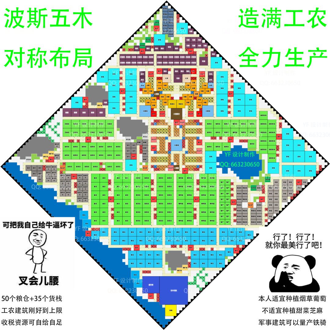 之前做了一个版本(https://www.taptap.com/topic/16297732),现在把布局图整体调整的更加对称,并且根据自身情况把具体建筑都安排了。现在有50个粮仓+35个货栈,满足强迫症。农业建筑刚好150个,工业建筑刚好100个,全力生产不留遗憾。工农业大致是按照收税要求建造的,争取做到自给自足,本人地图适合种植烟草葡萄,不适合种植甜菜芝麻,如果不一样则可以自行调整相应的田地数
