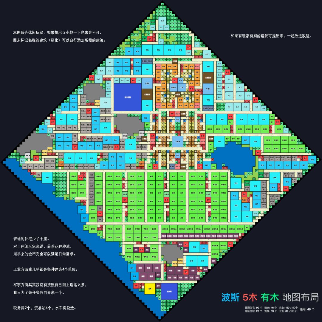 忘了是去年还是前年做的了,当时实在找不到合适的能从开头用到结尾不需要改布局图,自己做了一个。 玩那个一级一级的模式可以直接用,不过我记得在前期的时候,好像是有点人手不太够,需要拆一些建筑,完成任务升级。 如果这游戏这两年没有加一些什么新的建筑的或者有什么更改的话,这个图肯定是能能用的。 我当时做好这张图之后,从一级开始玩到全建满,在这期间也改了很多次,这是建完之后的最后成品图。 这几年没再玩啦,今
