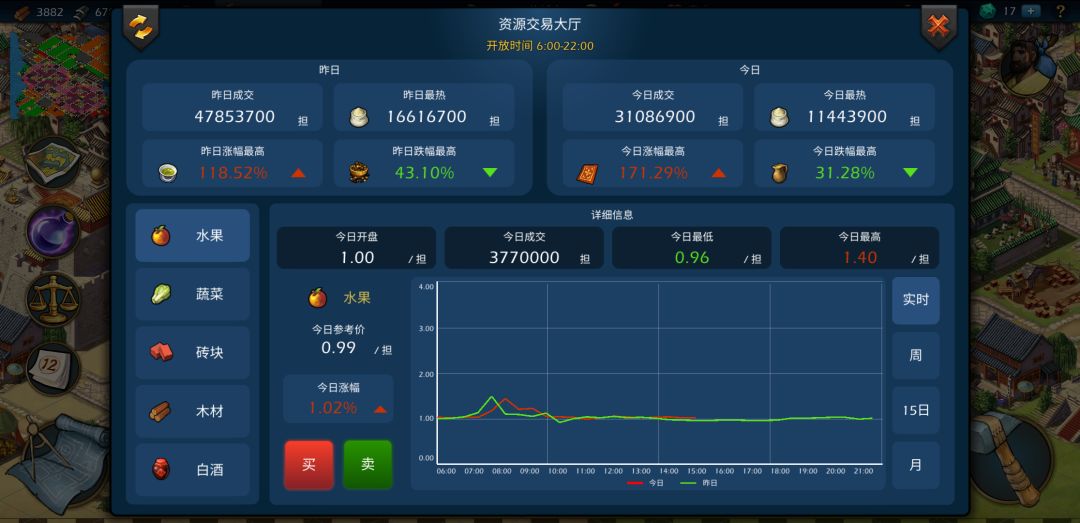 ──────贸易控玩法─────── 了解贸易玩法,首先要有足够的仓库和贸易站,仓库分为粮仓和货栈,所以要清楚自己存货用的是哪种仓库,其次就是贸易站了,通过贸易站挂物资让他人在交易所购买,你就可以获得对应的金币,一个贸易站只有600的容量,加上上货到交易所有延迟,所以贸易站越大物品店流通越好,不需要频繁的上架货物,有助于快速出售,特权贸易控一级加百分之150的容量,二级加百分之两百容量,当贸易站达到一定容量的时候,升特权等级就比直接建造贸易站快了。 根据每天物资价格的波动,可以挑准时机购货和出货,下面我们看看今天的几个主要物资的波动 对比发现,8-11点的价格普遍是比较高的,特别是鱼,但是到了晚上19-22的时候价格就降下去了,这个时候我们可以屯货等到第二天早上再出货就可以赚差价。 总体来说,官方的这个交易所还是一个很不错的玩点,有相关的金融游戏的体验,还有相对应的控制市场稳定的策略,单单是靠几个人的力量是影响不了市场的,只有顺势而为,才能获得最好的游戏体验。 最后欢迎加入中国二区模拟帝国贸易交流群:811691150