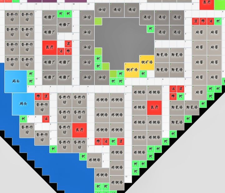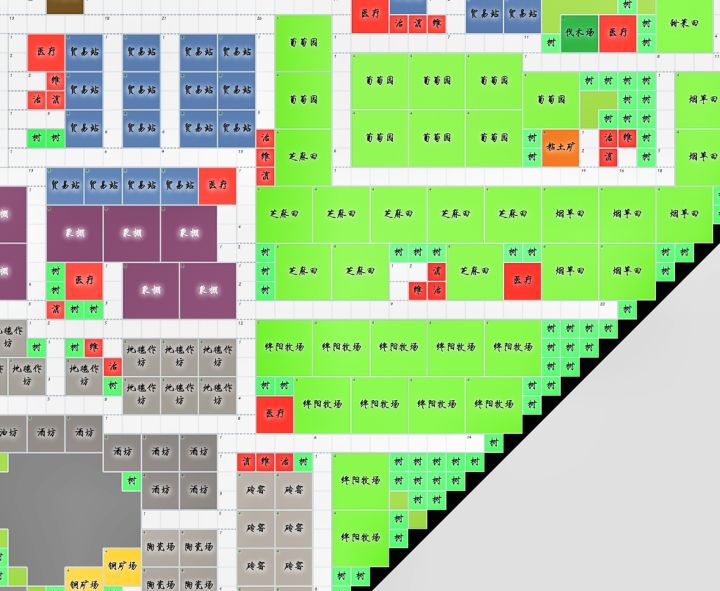 忘了是去年还是前年做的了,当时实在找不到合适的能从开头用到结尾不需要改布局图,自己做了一个。玩那个一级一级的模式可以直接用,不过我记得在前期的时候,好像是有点人手不太够,需要拆一些建筑,完成任务升级。如果这游戏这两年没有加一些什么新的建筑的或者有什么更改的话,这个图肯定是能能用的。我当时做好这张图之后,从一级开始玩到全建满,在这期间也改了很多次,这是建完之后的最后成品图。这几年没再玩啦,今