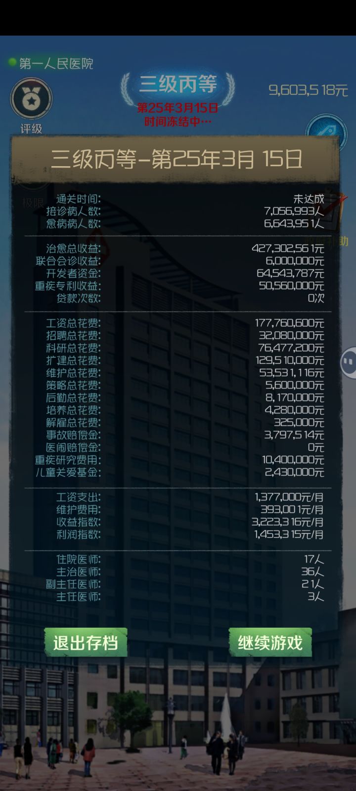 这也太漫长了,玩了十多个小时,16年,看了无数个广告,招的医生从20多岁变成40岁了,还是2级乙等,一年的收入大概只够扩建一个科室,感觉等我扩建完了招的医生都要退休了,通关遥遥无期。。。我之前玩似乎不是这样的,那时候科研和策略都没有这么贵,还有富商帮忙扩建的随机事件