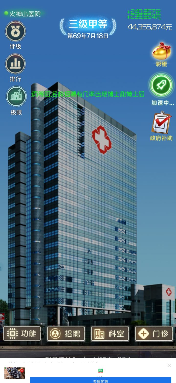 玩了2天,一开始很吸引人,但没多久就索然无味了,来来去去的就是陈咬金三板斧,就是简单的重复。三甲目前科室世界级,科研3个10级。剩下的也就是交给时间,把主任医师培养好了各科10级重症自然研究成功。各科都是教授,开始科研成功率低,可以一边接教学任务提升一边用钱砸科研次数提升,每次提升2%,时间会让可以成功。再后面的利润率就更简单了,上面的都完成后,各科室进行人员精简,按1-10级接诊人数进行医生配置