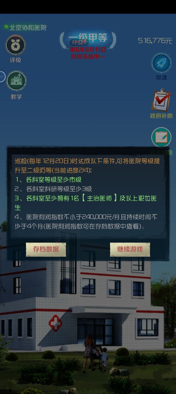 玩了2天,一开始很吸引人,但没多久就索然无味了,来来去去的就是陈咬金三板斧,就是简单的重复。三甲目前科室世界级,科研3个10级。剩下的也就是交给时间,把主任医师培养好了各科10级重症自然研究成功。各科都是教授,开始科研成功率低,可以一边接教学任务提升一边用钱砸科研次数提升,每次提升2%,时间会让可以成功。再后面的利润率就更简单了,上面的都完成后,各科室进行人员精简,按1-10级接诊人数进行医生配置