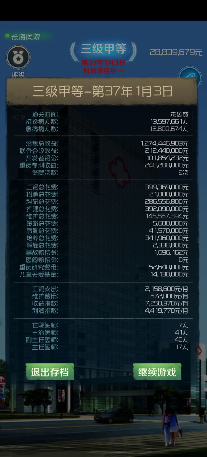 玩了2天,一开始很吸引人,但没多久就索然无味了,来来去去的就是陈咬金三板斧,就是简单的重复。三甲目前科室世界级,科研3个10级。剩下的也就是交给时间,把主任医师培养好了各科10级重症自然研究成功。各科都是教授,开始科研成功率低,可以一边接教学任务提升一边用钱砸科研次数提升,每次提升2%,时间会让可以成功。再后面的利润率就更简单了,上面的都完成后,各科室进行人员精简,按1-10级接诊人数进行医生配置