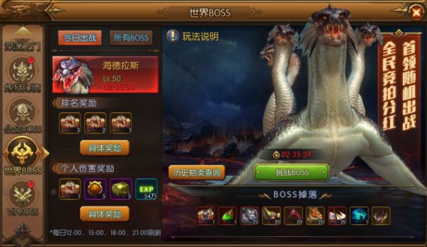 在《权利与荣耀》的大陆上有这么一个传说:路西法降临时带来了五只强大的恶魔,他们体型巨大,长相丑陋,绝非以一两人之力可以战胜。为了对抗这股邪恶的势力,精英猎魔人组成了猎魔团,收集掌握这些恶魔的动向。尽管死伤惨重,我们还是掌握了一些珍贵的资料。 参与世界BOSS,全民分享工资每日的12:00、15:00、18:00、21:00都会随机刷新一只世界BOSS,击败后会掉落及其稀有的装备和道具,通