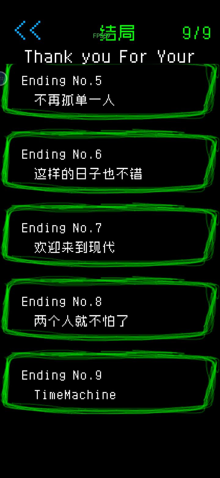 ·结局五「不再孤单一人」这个超难…真的很难想到要这么多组合。意义不明的钥匙居然真的可以打开未来的某个房间(这里我点太快了没看太清,有遗漏大家可以补充),撬棍是用来撬门的(大概),螺丝刀修无线电,然后电池让无线电工作。结局就是有直升机来救后代。人类真的很顽强,这样的环境下也有幸存者聚在一起活了下来,然后接收到了后代发出的信号~我还蛮喜欢这个结局的,有种充满希望的感觉。