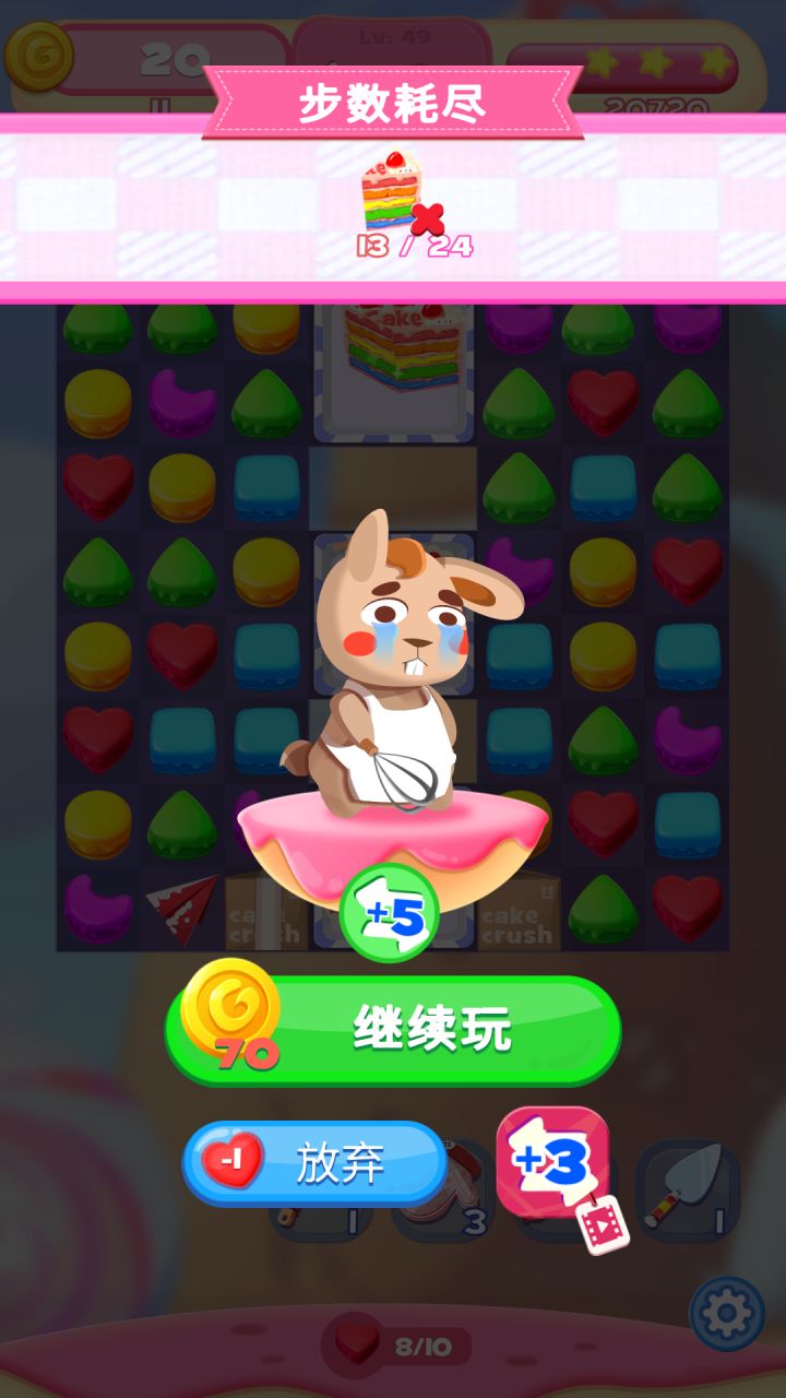 步数和可以消除次数不对等,前期要消耗大量步数去消除箱子。等箱子消除差不多了,能消除的蛋糕步数基本就没有了。实验了两次都是这样,这关场景比较窄凑红心基本不能了。