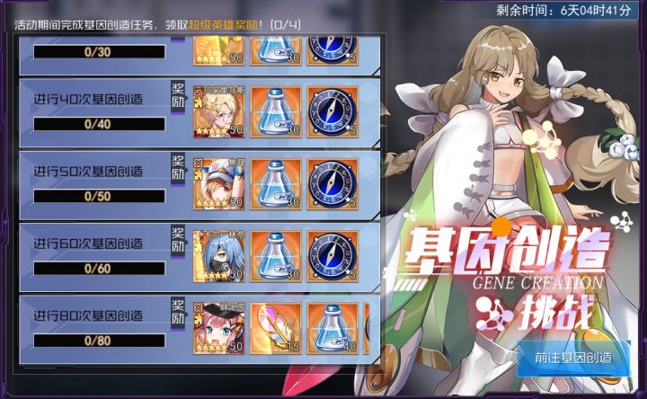 活动时间:7月10日0点到7月16日23点59分,以实际活动开启时间为准。一、基因创造挑战:活动期间,基因创造次数达到指定次数可获得丰厚奖励。二、学院任务:活动期间,完成骑士收集任务可获得构建图谱/超级基因/红色装备。三、哈伯的星盘礼包:活动期间,哈伯的星盘礼包提供购买。四、春田的药剂商店:活动期间,星盘/超级基因/试验药剂/5星英雄碎片,消耗钻石提供购买。五、哈伯的药剂回收处:活动期间