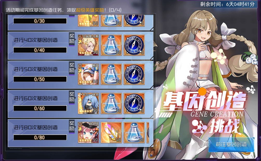 喂,喂,这里是白兔的说。嘿,时隔一周,我们又见面啦。最近总是感觉手脚不太灵活的样子,是不是因为一直淋雨导致机械关节出了问题呀?唉,得抽时间回去“那边”仔细检修一下了……嗯,废话不多说,先让我给大家带来最新的学院活动情报!基因创造挑战:活动期间,基因创造次数达到指定次数可获得丰厚奖励。学院任务:活动期间,完成骑士收集任务可获得构建图谱/超级基因/红色装备。春田的药剂商店:活动期间,星盘/