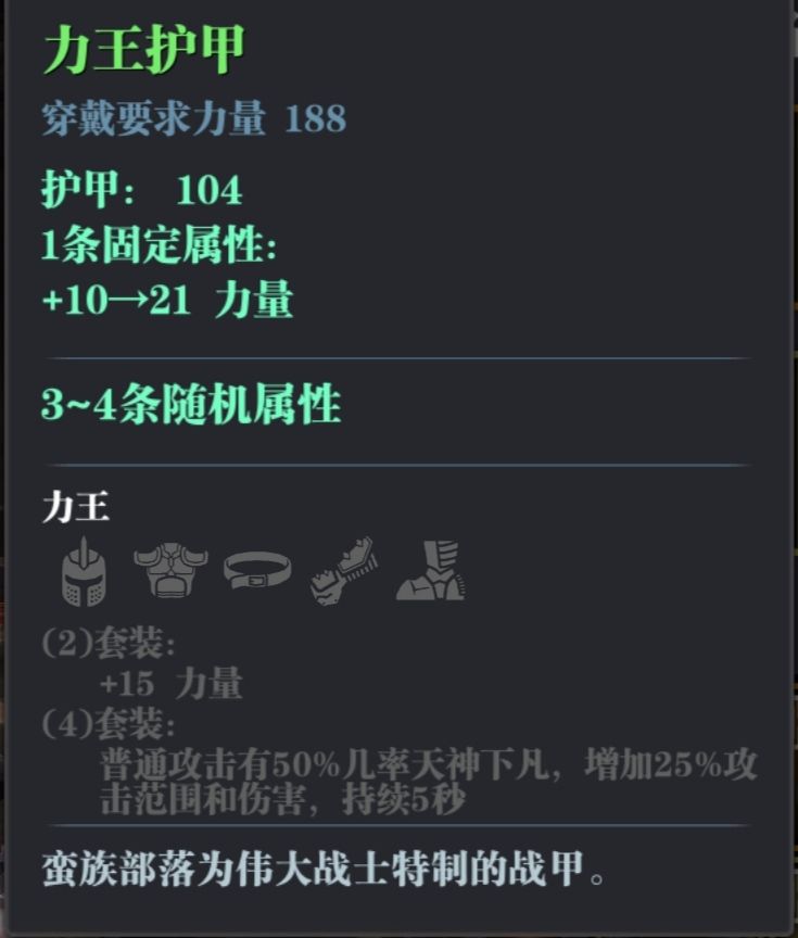 个人理解,我参加过三次测试套装变动每次都有。但目前马上正式上线了,应该变动不会太大了。我也凭个人理解说下游戏能做的套装吧。 ①6级力王套 6级的装备前期还是比较不好做的,需要不停刷图找水晶打材料。但是材料的产出不受限制。虽然有点肝。但是容易做,不受鞭尸刀限制。力王套4件效果在前期相当于白嫖25%的普攻伤害。但是由于是主力的原因,武器推荐大剑。双刀和斧头不是很推荐。大剑的话考普攻输出,技能选择猛击(