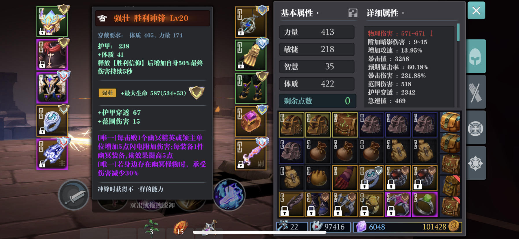 装备强化详细介绍 强化分为装备词缀强化和槽位强化 一、词缀强化指的是装备自带词缀的属性强化,不同等级的装备词缀强化需要的材料(金币和强化石)数量是不一样的,等级越高,需要的材料也就越多。金币和强化石可以通过每日狩猎、特殊活动、季卡奖励、商店购买、刷图等途径获取,属于游戏的刚需物资。装备词缀是可以进行洗练的,通过词缀石碎片在铁匠处合成对应部位的洗练石进行洗练。 二、槽位强化是指对装备对应的部位进行的一个属性强化,需要的材料同样是金币和强化石。槽位属性是随机的,可通过购买季卡自由选择。 三、装备洗练:消耗印记可对装备进行洗练(属性条数掉落即固定,洗练只能改变属性,不能改变属性条数) Tip:资源有限的情况下优先选择强化属性好的装备词缀,主要强化3件(达到一定等级可解锁天赋里的额外属性)