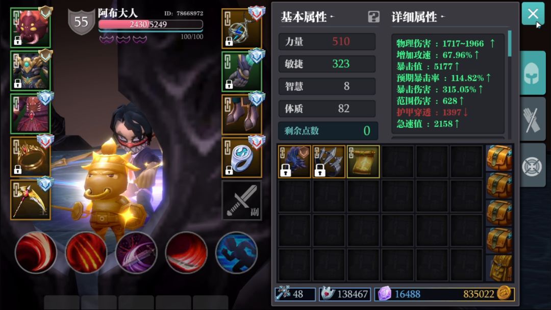 发这种贴真麻烦,还是喜欢那种简单(装逼)的帖子,实力不允许啊!废话不多说下面分享 打30boss站撸是完全没问题的,但要注意一点频繁受到伤害不要直接干死boss,不然剧情可能掉血而亡 没啥好讲的,机制大家都懂进入正题(加载太慢32boss就不放了,需要可以私我,25boss几秒的事) 磨盘,初始适合跑图,旋转成爆潜跟刃护体(关键就在这儿刃护体直接将我的伤害从70万+一度飚到110万+) 虽然相比之