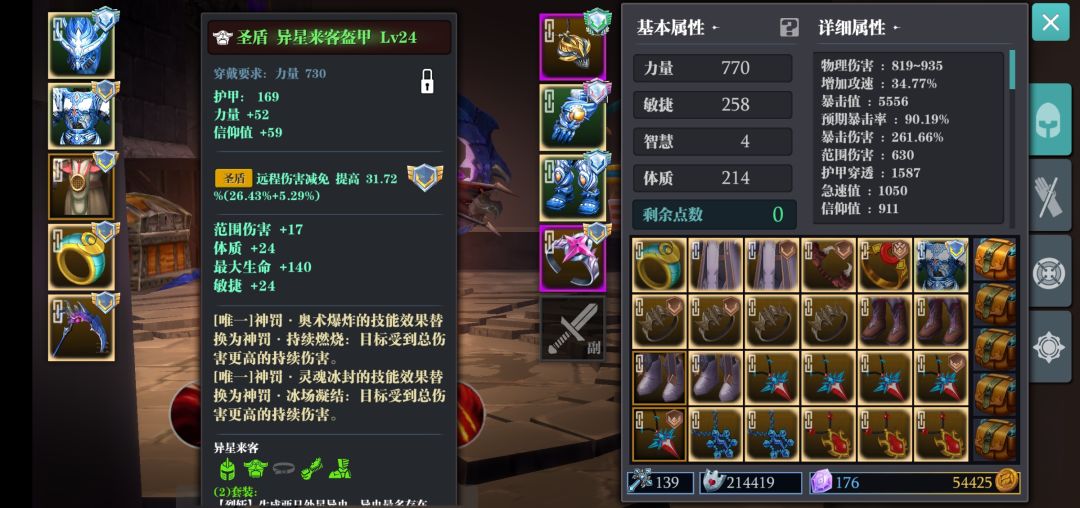 几点细节分享: 异星镰刀有减伤和回复,靠自身身板强度在轮回和无尽深渊里均有不错表现,但是玩的还是很少,催一下生,好像有点晚^_^ 天赋:为达到输出最大化,选剑盾 刚玩的可以选皇冠、斧头、魔气天赋均可,各有千秋。 符文:魔战士+健/坚+生命/护甲,懂得都懂 法盘:虚无+霸体+威力/防御(根据自身条件选一个,缺啥补啥) 视频中血量14000+,回血3600+,信仰值5200,不提面板都是耍流氓…… 轮