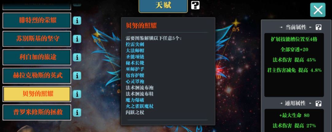 魔渊之刃星之神使装备可以用来献祭天赋。 一、天赋系统 1、同一个装备前4次专属装备献祭换通用点; 2、第5次献祭换专属点; 3、同一个装备献祭5次后不能再献祭; 4、每个体系最多12点; 5、8(武器加通用)×12(每样12种)×5(每种5件)一共480件,每个天赋60件特定装备。 以法师为例,假设有“贝努的照耀”的装备,就需要将“贝努的照耀”下12种装备每种各神祈5件,才能获得总共12点专属点,