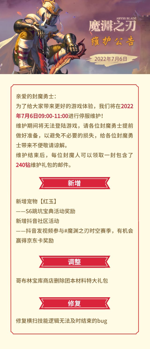 亲爱的封魔人大家好~明天上午9-11点 魔渊将迎来日常维护届时将无法登录游戏~请记得及时保存进度避免产生不必要的损失哦~本次更新后将会开启圣域骑士活动超多赛季资源 助你实力超群 傲视群雄~快来看看详情吧~=圣域骑士降临活动=//活动签到限时开启活动期间进行登录可获得星辰碎块、行动点令牌、随机词缀石碎片、钻石以及活动道具[能量核心]//鎏光青彩时装奖池本奖池含有A级时装[圣光