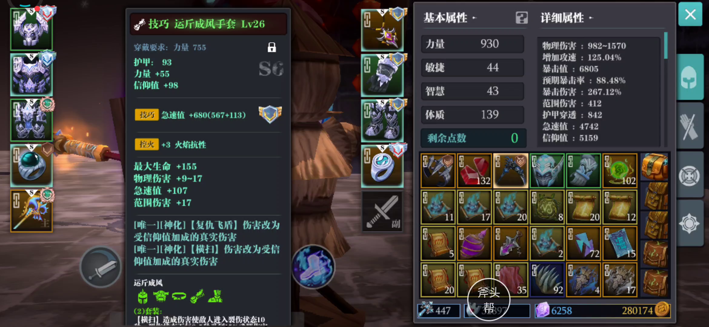 装备不齐全,戒指项链都是力量属性拼凑的 打深渊能稳定到12层,得4个深渊灵骸,现阶段凑合用吧 成品应该五件套+赐福平定斧头+乌桑戒指+团本戒指+乌桑项链