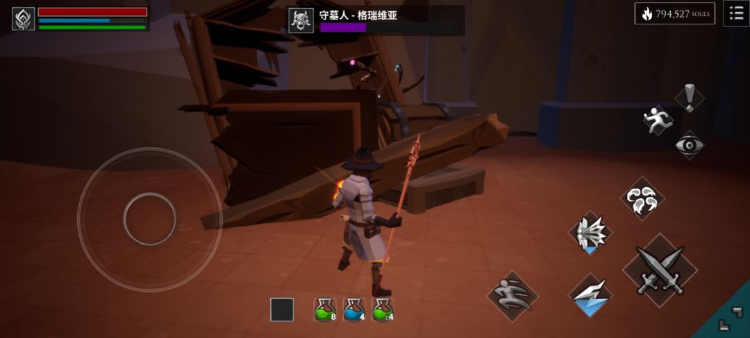 除去温德鲁姆平原的两位和沙漠的小兵以外,全新的boss是这三个人形怪 1.守墓人-格瑞维亚,冰系镰刀怪。个人认为守墓人很阴间,伤害特别高,前摇不明显且后摇短,主要攻击方式为镰刀两段挥舞、重击、飞扑重击和阴间大风车。尤其要注意阴间大风车,不像兽王大风车,守墓人阴间大风车持续时间更长,范围更大还会追着玩家旋,守墓人连招其实并不连贯,打它要注意不贪刀和及时追刀 守墓人在战斗时会突进一两段追击玩家,切记保